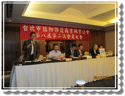 本會第八屆第二次會員大會於民國 102.05.10(五)下午三時三十分,假台北凱撒大飯店四樓北京廳正式召開,蔡理事長崇禮擔任主席,鍾常務理事振平擔任司儀,主席團成員為全體常務理、監事,會議準時進行,各項致詞、報告皆如程序表,通過大會例行提案:各項預算、決算、基金收支表、資產負債表、工作計畫等等,會議進行順暢,諸項報告也都詳盡,現場沒有臨時動議,稍事休息後,遂進行專題演講,邀請防檢局馮副局長海東主講:農藥管理的現況與展望, 大家齊聚一堂專心聆聽,六時三十分,馮副局長講畢並接受二個提問,主席宣布散會並餐敘開始。秘書處請大家繳回名牌以領取兩小時之農藥講習複訓貼紙。